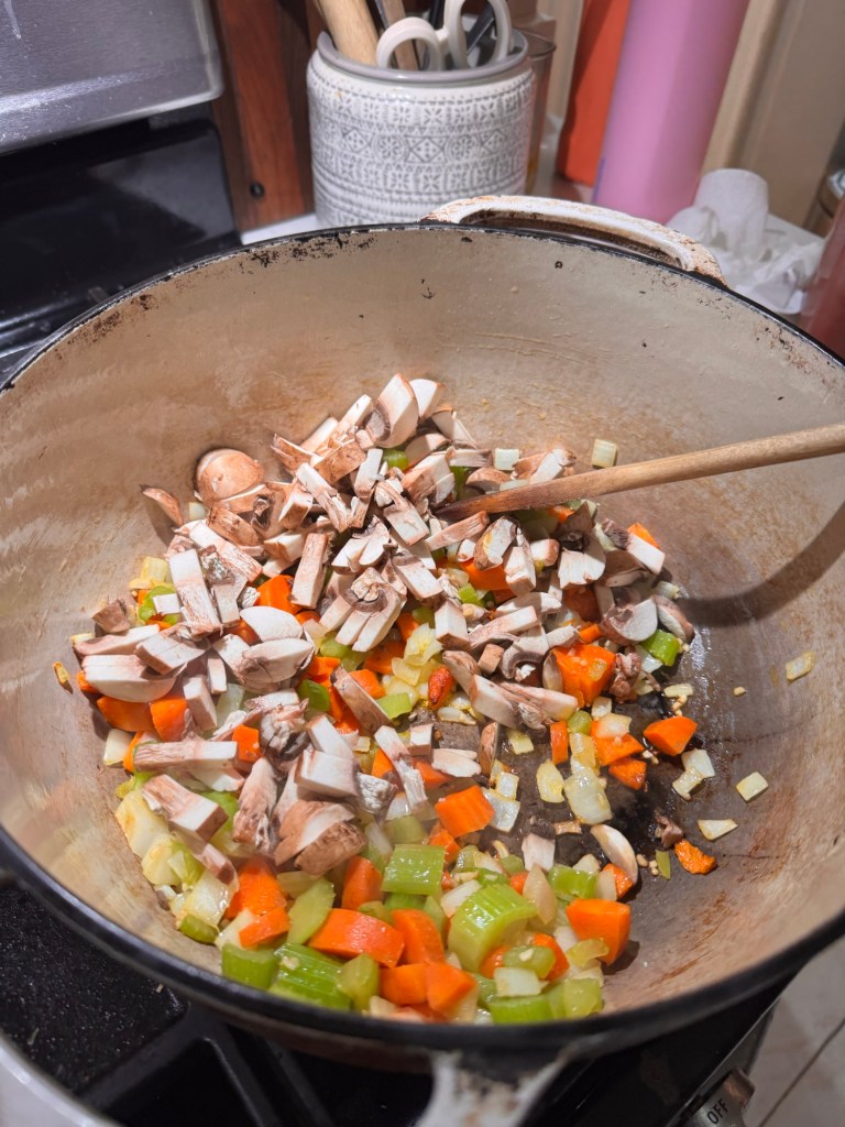Any extra vegetables you have on hand (this week I added mushrooms so they wouldn’t go to waste)