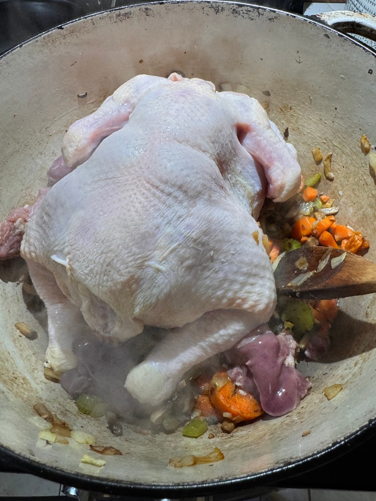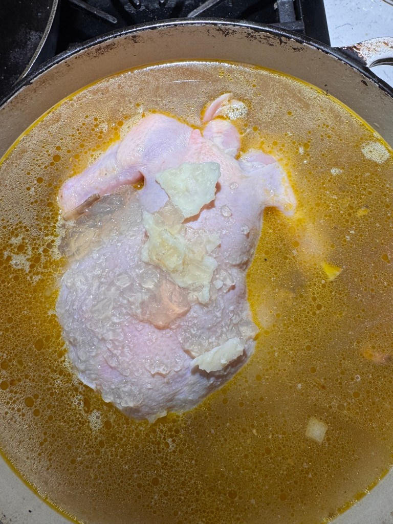 Bring everything to a gentle boil, then reduce to a simmer. Cover and let it cook slowly until the chicken is tender and falling apart. This usually takes about 1½ to 2 hours, depending on the size of your chicken.
